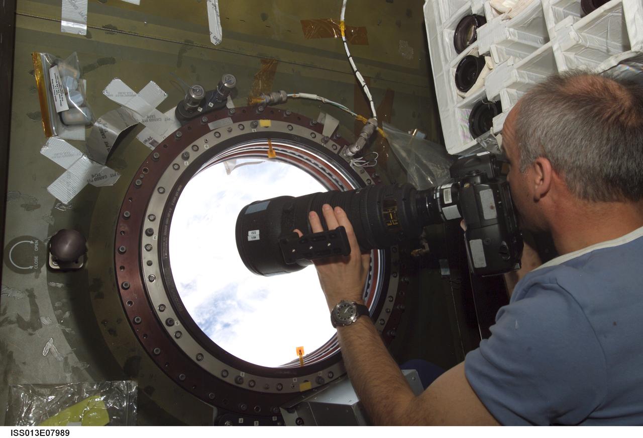 Williams photographs at the Earth Observation window during Expedition 13