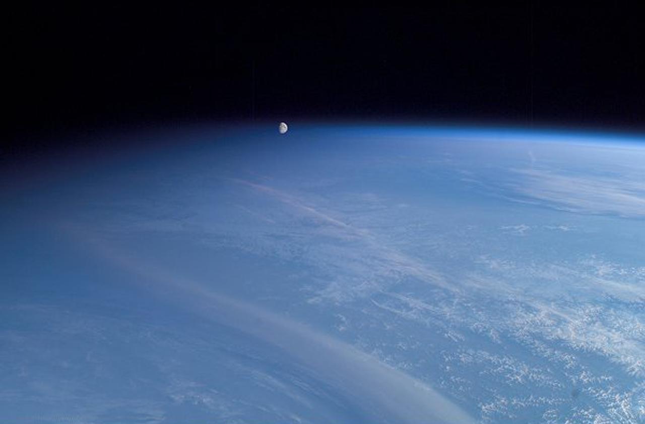Many odd looking moon photos have been captured over the years by astronauts aboard the International Space Station. Even so, this photograph, taken by the crew over Russia on May 11, 2003, must have come as a surprise. The moon which is really a quarter of a million miles away, appears to be floating inside the Earth's atmosphere. The picture is tricky because of its uneven lighting. With the sun's elevation angle at only 6 degrees, night is falling on the left side of the image while it is still broad daylight on the right side. This gradient of sunlight is the key to the illusion.
