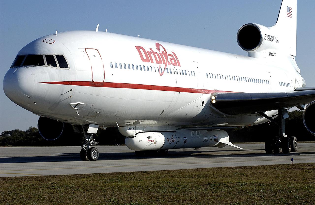 KENNEDY SPACE CENTER, FLA. -- The Orbital Sciences Corp.'s L-1011 aircraft sits on the Skid Strip, Cape Canaveral Air Force Station, with the Pegasus rocket attached below. The Pegasus will carry into space the Galaxy Evolution Explorer (GALEX), an orbiting space telescope that will observe galaxies in ultraviolet light across 10 billion years of cosmic history. Led by the California Institute of Technology, GALEX will conduct several first-of-a-kind sky surveys, including an extra-galactic (beyond our galaxy) ultraviolet all-sky survey. During its 29-month mission GALEX will produce the first comprehensive map of a Universe of galaxies under construction, bringing more understanding how galaxies like the Milky Way were formed. GALEX is due to be launched from Cape Canaveral Air Force Station March 25.