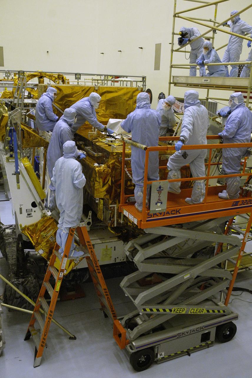 CAPE CANAVERAL, Fla. – In the Payload Hazardous Servicing Facility at NASA’s Kennedy Space Center, crew members with the STS-125 mission get a close look at some of the equipment associated with their mission to service NASA’s Hubble Space Telescope. Reaching over the Main Electronics Box is Mission Specialist Mike Massimino, replacing the cover. The STS-125 crew is taking part in a crew equipment interface test, which provides experience handling tools, equipment and hardware they will use on their mission. Space shuttle Atlantis is targeted to launch on the STS-125 mission Oct. 10. Photo credit: NASA/Kim Shiflett