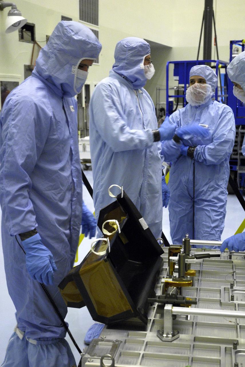 CAPE CANAVERAL, Fla. – In the Payload Hazardous Servicing Facility at NASA’s Kennedy Space Center, crew members with the STS-125 mission get a close look at some of the equipment associated with their mission to service NASA’s Hubble Space Telescope. At left, Mission Specialist John Grunsfeld looks at the RSU changeout tool latched in place on the Small ORU Protective Enclosure, or SOPE. The STS-125 crew is taking part in a crew equipment interface test, which provides experience handling tools, equipment and hardware they will use on their mission. Space shuttle Atlantis is targeted to launch on the STS-125 mission Oct. 10. Photo credit: NASA/Kim Shiflett