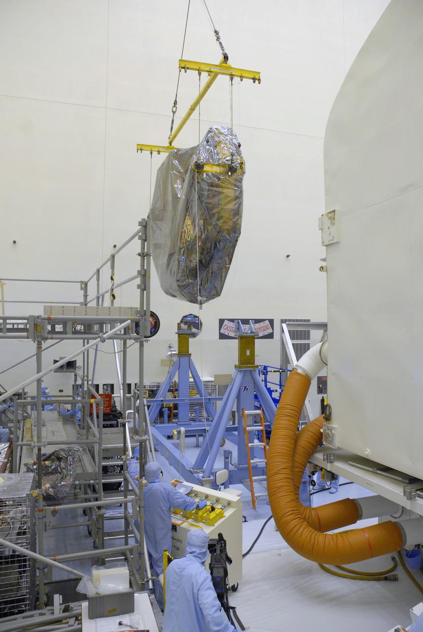 CAPE CANAVERAL, Fla. - In the Payload Hazardous Servicing Facility, or PHSF, at NASA's Kennedy Space Center in Florida, a crane lowers the Multi-Use Lightweight Equipment, or MULE, carrier toward a stand. The carrier contains hardware for the STS-125 Hubble Space Telescope servicing mission that has been returned to the PHSF to await a new launch date for the mission. Atlantis' targeted launch on Oct. 14 was delayed when a system that transfers science data from the orbiting observatory to Earth malfunctioned on Sept. 27. The new target launch date is under review. Photo credit: NASA/Kim Shiflett
