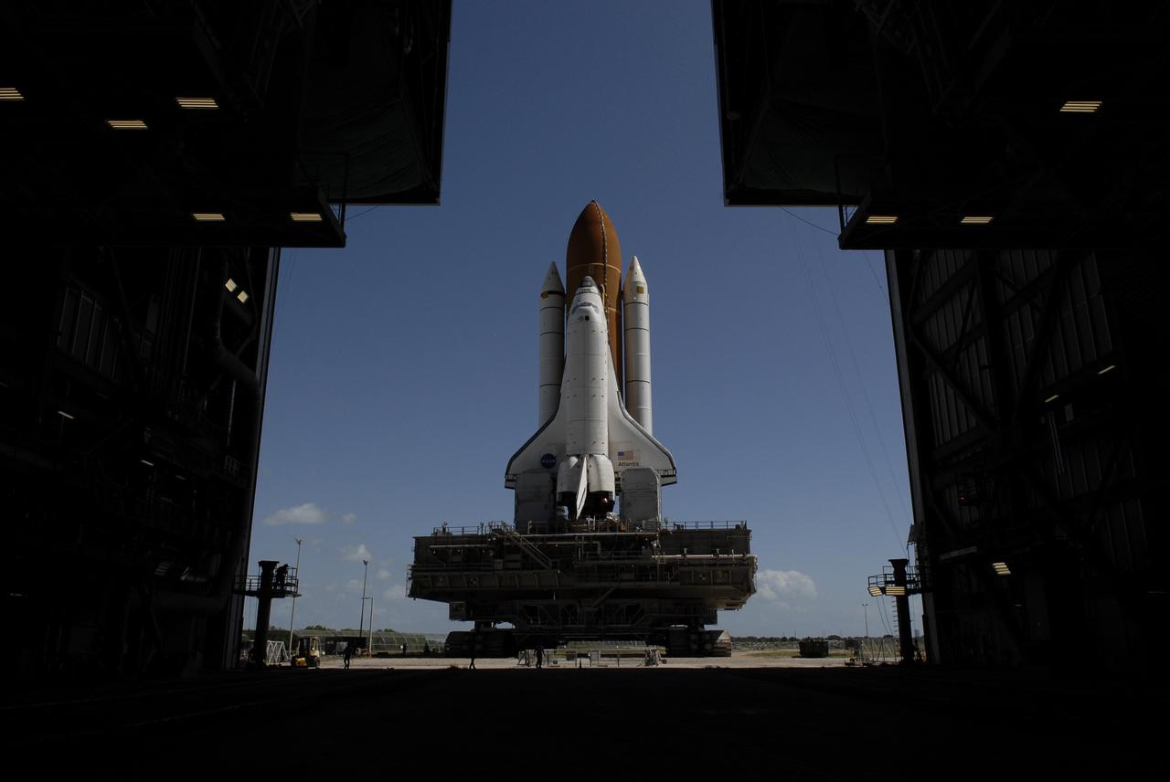 CAPE CANAVERAL, Fla. - Space shuttle Atlantis rolls toward the open doors of the Vehicle Assembly Building at NASA's Kennedy Space Center in Florida after rolling back from Launch Pad 39A. In the VAB, Atlantis will await launch on its STS-125 mission to repair NASA's Hubble Space Telescope. First motion of Atlantis off the pad was at 6:48 a.m. EDT. The journey was expected to take about six hours. Atlantis' targeted launch on Oct. 14 was delayed when a system that transfers science data from the orbiting observatory to Earth malfunctioned on Sept. 27. The new target launch date is under review. Photo credit: NASA/Kim Shiflett