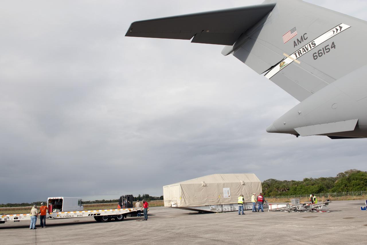 CAPE CANAVERAL, Fla. – Workers prepare to load NASA's TDRS-L satellite onto a trailer at the Shuttle Landing Facility at NASA's Kennedy Space Center in Florida. The TDRS is the latest spacecraft destined for the agency's constellation of communications satellites that allows nearly continuous contact with orbiting spacecraft ranging from the International Space Station and Hubble Space Telescope to the array of scientific observatories. Photo credit: NASA/Charisse Nahser