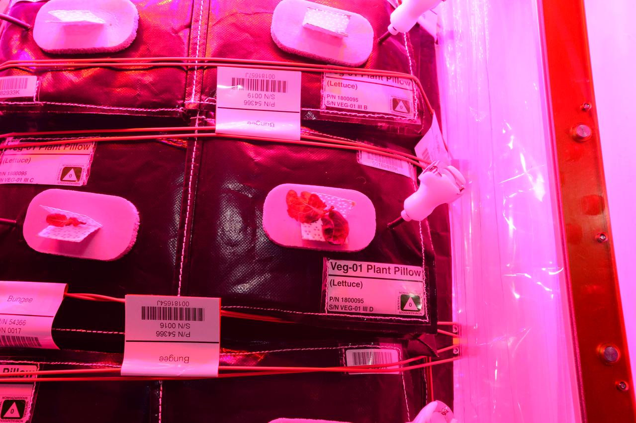 Astronaut Scott Kelly initiated VEG-01 B, the second crop of lettuce, on July, 8, 2015, and both Kelly and Astronaut Kjell Lindgren cared for the plants. The crop grew for 33 days. VEG-01 B included one set of six plant pillows planted with red romaine lettuce seeds. On Aug. 10, 2015, the crew harvested and consumed leaves from each plant. This was the first crop grown and consumed in NASA hardware. They harvested the rest of the plant tissue and froze it in the station’s Minus Eighty-Degree Laboratory Freezer for ISS (MELFI) for return to Earth for further study including microbial analysis, antioxidant capacity, mineral analysis and anthocyanin concentration.