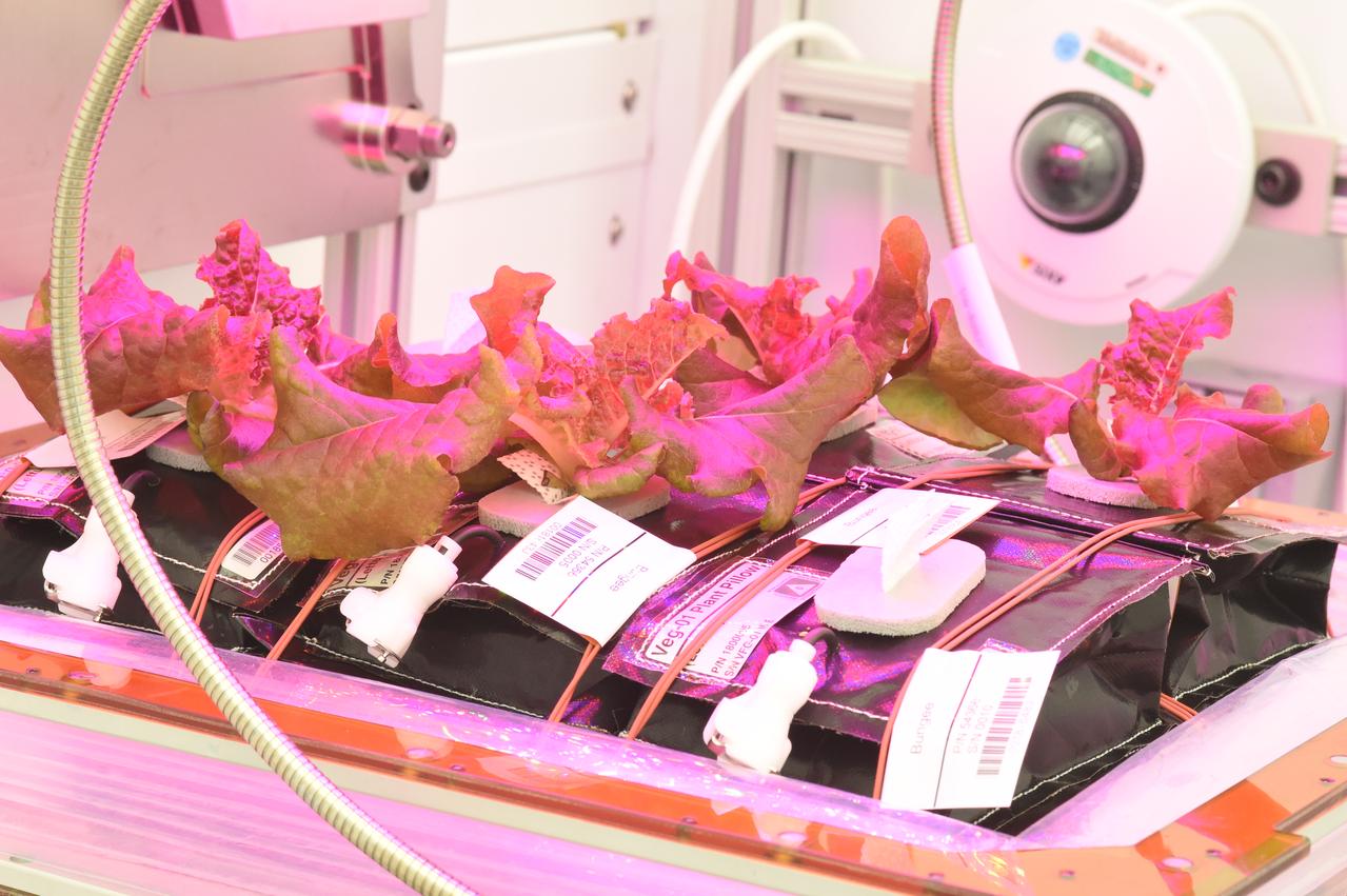 Astronaut Scott Kelly initiated VEG-01 B, the second crop of lettuce, on July, 8, 2015, and both Kelly and Astronaut Kjell Lindgren cared for the plants. The crop grew for 33 days. VEG-01 B included one set of six plant pillows planted with red romaine lettuce seeds. On Aug. 10, 2015, the crew harvested and consumed leaves from each plant. This was the first crop grown and consumed in NASA hardware. They harvested the rest of the plant tissue and froze it in the station’s Minus Eighty-Degree Laboratory Freezer for ISS (MELFI) for return to Earth for further study including microbial analysis, antioxidant capacity, mineral analysis and anthocyanin concentration.