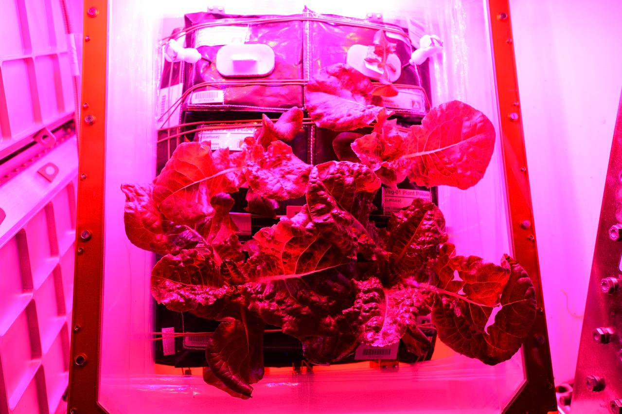 Astronaut Scott Kelly initiated VEG-01 B, the second crop of lettuce, on July, 8, 2015, and both Kelly and Astronaut Kjell Lindgren cared for the plants. The crop grew for 33 days. VEG-01 B included one set of six plant pillows planted with red romaine lettuce seeds. On Aug. 10, 2015, the crew harvested and consumed leaves from each plant. This was the first crop grown and consumed in NASA hardware. They harvested the rest of the plant tissue and froze it in the station’s Minus Eighty-Degree Laboratory Freezer for ISS (MELFI) for return to Earth for further study including microbial analysis, antioxidant capacity, mineral analysis and anthocyanin concentration.