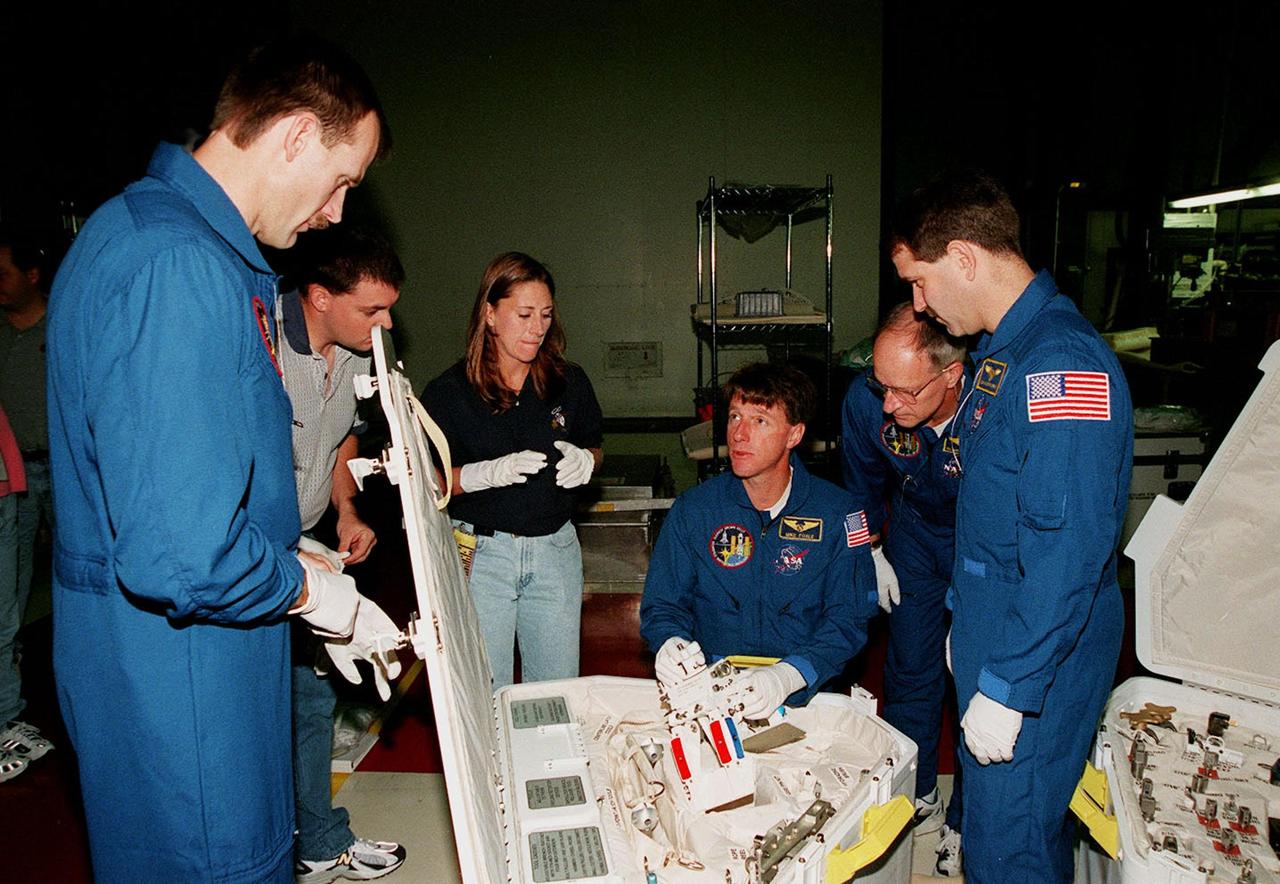During a Crew Equipment Interface Test (CEIT), members of the STS-103 crew check out tools to be used on planned Extravehicular Activities (EVAs) on the mission for repair of the Hubble Space Telescope. In uniform, from left, are Mission Specialists Steven L. Smith, C. Michael Foale (Ph.D.), Claude Nicollier of Switzerland, and John M. Grunsfeld (Ph.D.). Other crew members at KSC for the CEIT are Commander Curtis L. Brown Jr., Pilot Scott J. Kelly, and Jean-François Clervoy of France. Nicollier and Clervoy are with the European Space Agency. Mission STS-103 is a "call-up" due to the need to replace portions of the pointing system, the gyros, which have begun to fail on the Hubble Space Telescope. Although Hubble is operating normally and conducting its scientific observations, only three of its six gyroscopes are working properly. The gyroscopes allow the telescope to point at stars, galaxies and planets. The STS-103 crew will not only replace gyroscopes, it will also replace a Fine Guidance Sensor and an older computer with a new enhanced model, an older data tape recorder with a solid-state digital recorder, a failed spare transmitter with a new one, and degraded insulation on the telescope with new thermal insulation. The crew will also install a Battery Voltage/Temperature Improvement Kit to protect the spacecraft batteries from overcharging and overheating when the telescope goes into a safe mode. The scheduled launch date in October is under review