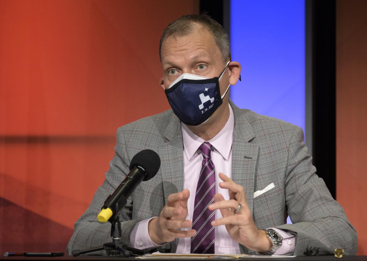 Associate Administrator of NASA's Science Mission Directorate, Thomas Zurbuchen, gives remarks during a NASA Perseverance rover press briefing about the search for ancient life at Mars and about samples to be brought back to Earth on a future mission, Wednesday, Feb. 17, 2021, at NASA's Jet Propulsion Laboratory in Pasadena, California. The Perseverance Mars rover is due to land on Mars Thursday, Feb. 18, 2021. A key objective for Perseverance’s mission on Mars is astrobiology, including the search for signs of ancient microbial life. The rover will characterize the planet’s geology and past climate, pave the way for human exploration of the Red Planet, and be the first mission to collect and cache Martian rock and regolith. Photo Credit: (NASA/Bill Ingalls)