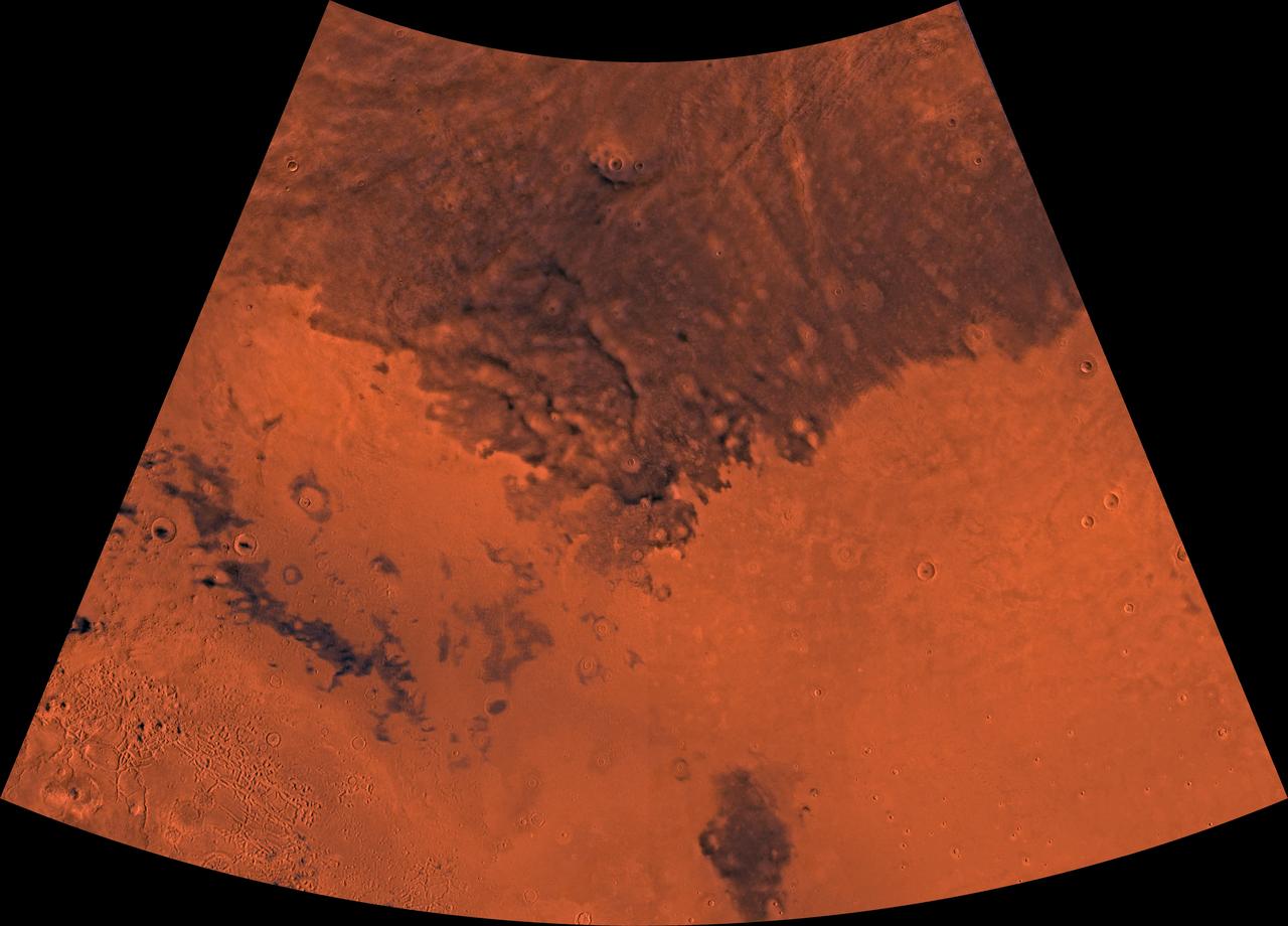 Mars digital-image mosaic merged with color of the MC-6 quadrangle, Casius region of Mars. This image is from NASA's Viking Orbiter 1. http://photojournal.jpl.nasa.gov/catalog/PIA00166