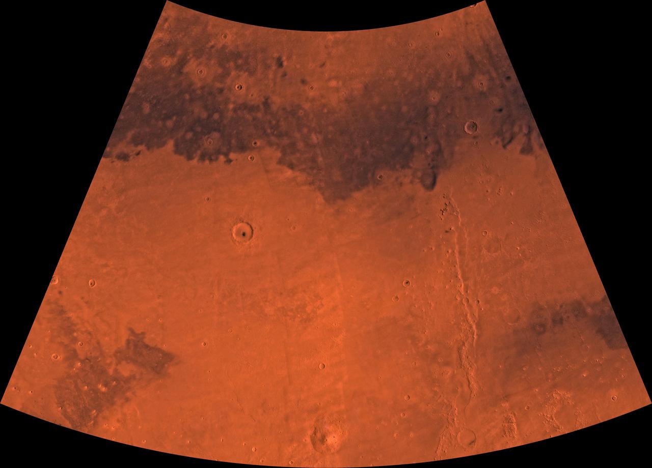 Mars digital-image mosaic merged with color of the MC-7 quadrangle, Cebrenia region of Mars. This image is from NASA's Viking Orbiter 1. http://photojournal.jpl.nasa.gov/catalog/PIA00167