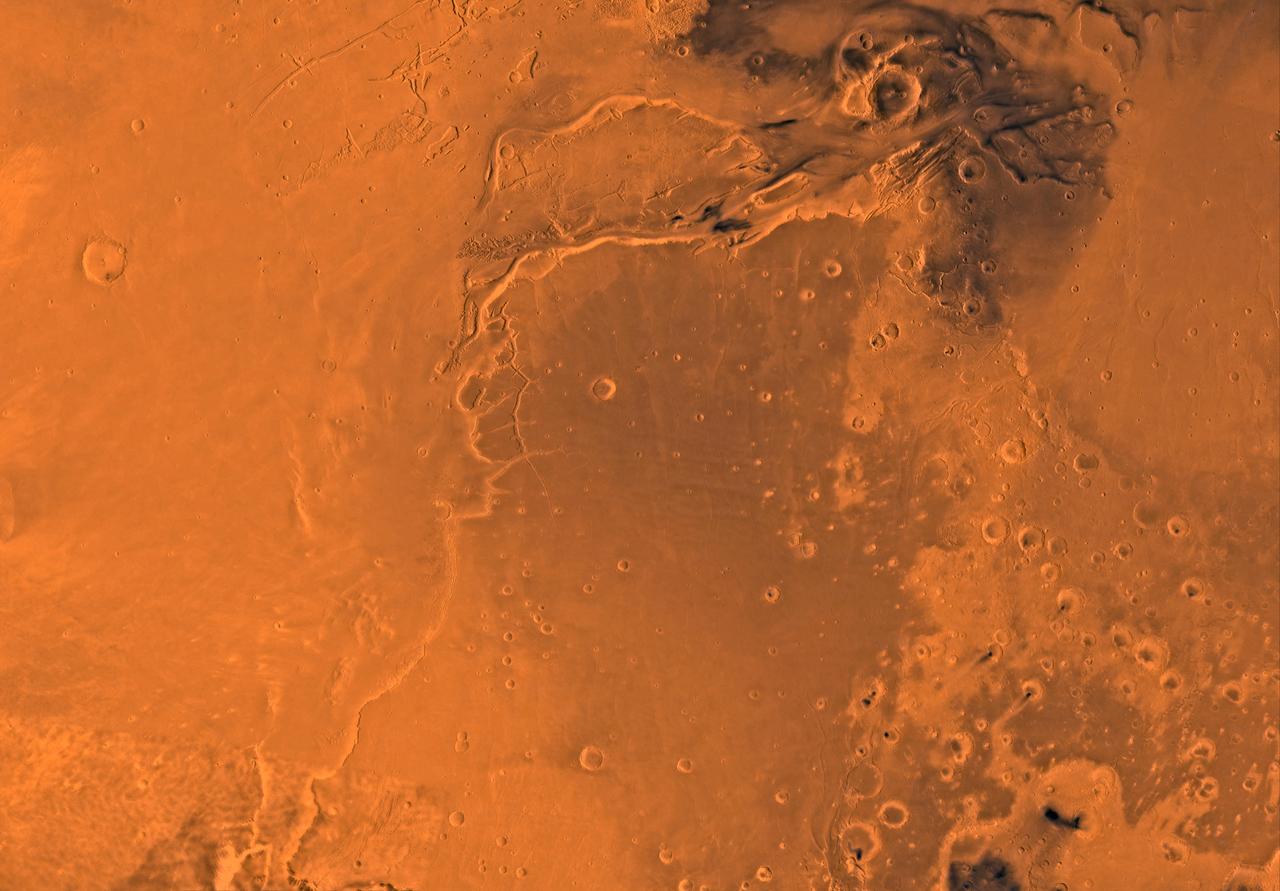 Mars digital-image mosaic merged with color of the MC-10 quadrangle, Lanae Palus region of Mars. This image is from NASA's Viking Orbiter 1. http://photojournal.jpl.nasa.gov/catalog/PIA00170