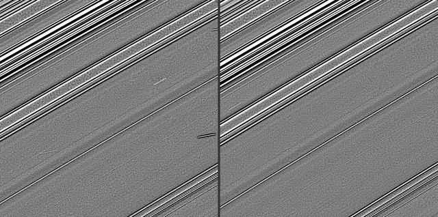 These two images, taken four years before Saturn’s August 2009 equinox by NASA Cassini spacecraft, indicate the streaks in these images are likely evidence of impacts into the planet’s rings.