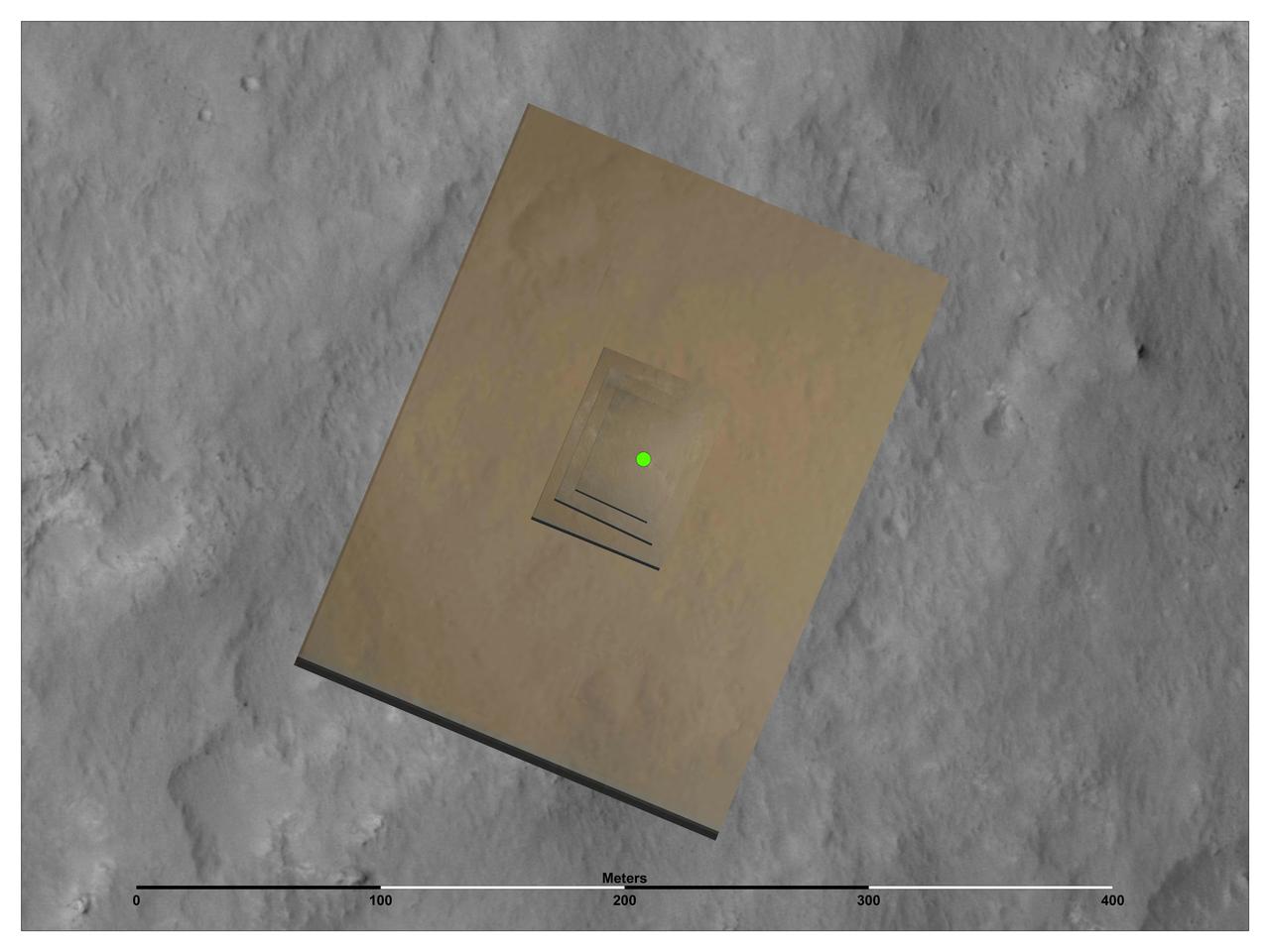 This image shows the location green where scientists estimate NASA Curiosity rover landed on Mars within Gale Crater, based on images from the Mars Descent Imager MARDI.