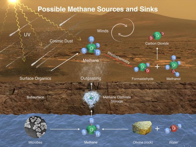 This illustration portrays possible ways methane might be added to Mars atmosphere sources and removed from the atmosphere sinks. NASA Curiosity Mars rover has detected fluctuations in methane concentration in the atmosphere.