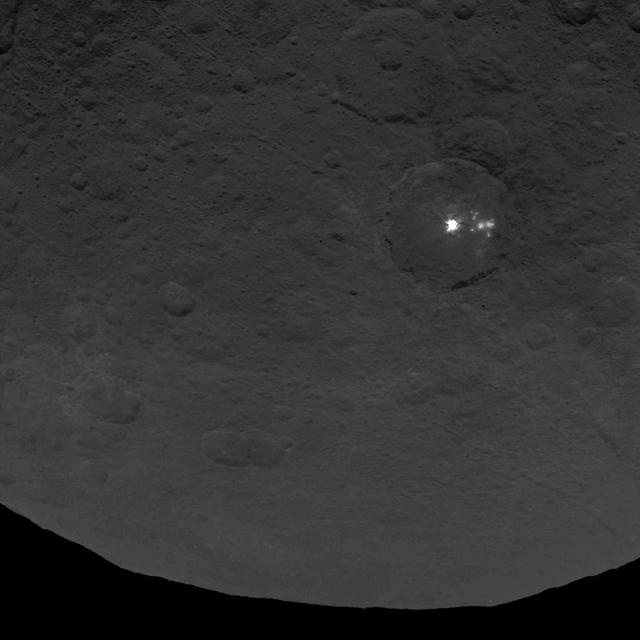 A cluster of mysterious bright spots on dwarf planet Ceres can be seen in this image, taken by NASA's Dawn spacecraft from an altitude of 2,700 miles (4,400 kilometers). The image, with a resolution of 1,400 feet (410 meters) per pixel, was taken on June 9, 2015. http://photojournal.jpl.nasa.gov/catalog/PIA19579