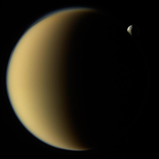 Saturn's moon Tethys disappears behind Titan as observed by Cassini on Nov. 26, 2009. Tethys is about 660 miles (1,070 kilometers) across. At about 3,200 miles (5,100 kilometers) wide, Titan is larger than the planet Mercury, and was much closer to Cassini than Tethys at the time of this image. Titan is planet-like in another way: it's wrapped in a thick atmosphere, which can be clearly seen here where it overlaps icy Tethys in the distance beyond. Cassini captured this natural-color image at a distance of approximately 620,000 miles (1 million kilometers) from Titan. The Cassini spacecraft ended its mission on Sept. 15, 2017. https://photojournal.jpl.nasa.gov/catalog/PIA22648