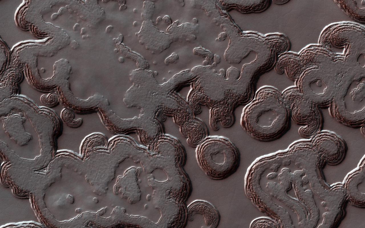 The Martian south polar cap is a layer of carbon dioxide ice, full of pits that make it look like Swiss cheese. The pits form when the Sun heats the ice and makes it sublimate (transform from a solid to a gas). Because it's at the pole, the Sun never gets very high in the sky, so steep slopes get more heat and sublimate faster, causing pits to form and grow. This is balanced by new carbon dioxide frost that forms on flatter areas. https://photojournal.jpl.nasa.gov/catalog/PIA22895