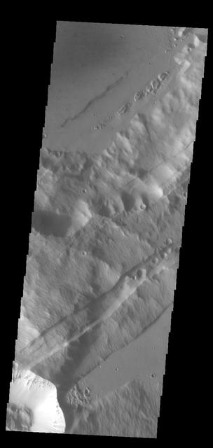 The linear depressions in this VIS image are part of Sirenum Fossae. These depressions are called graben, which form by the down drop of material between two parallel faults. The faults are caused by extensional tectonic stresses in the region. The fossae are 2735km long (1700 miles). Orbit Number: 83767 Latitude: -25.1526 Longitude: 220.709 Instrument: VIS Captured: 2020-11-01 15:42 https://photojournal.jpl.nasa.gov/catalog/PIA24287