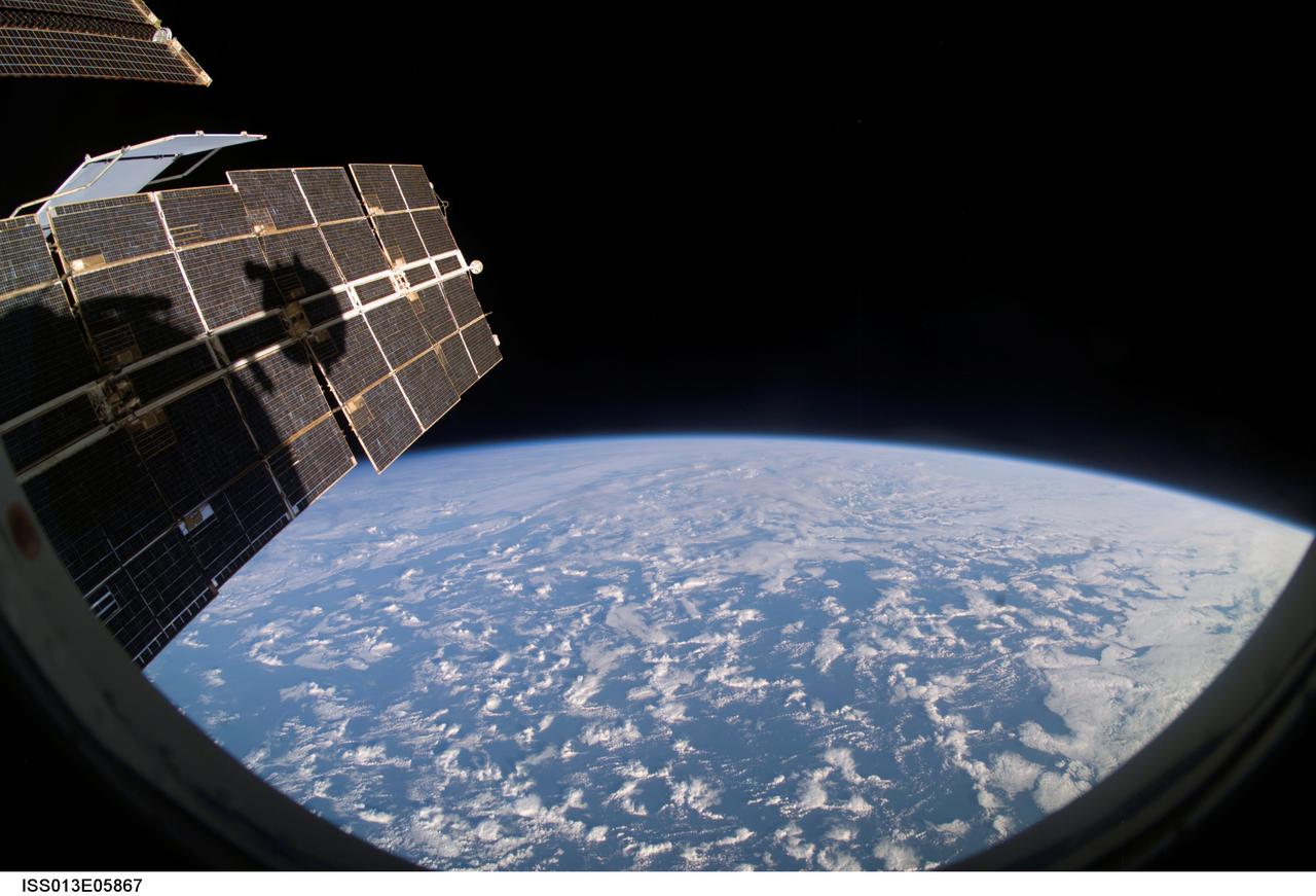 ISS013-E-05867 (11 April 2006) --- Earth’s horizon and station solar array panels are featured in this image photographed by an Expedition 13 crewmember from a window on the International Space Station.