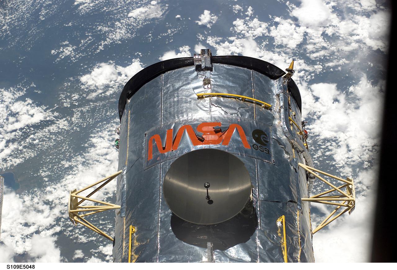 STS109-E-5048 (3 March 2002) --- The top portion of the Hubble Space Telescope is photographed some 350 miles above the Pacific Ocean Southwest of Mexico, as the Space Shuttle Columbia is about to use its 50-foot-long robotic arm to lower the telescope into its cargo bay. The image was one of a series recorded with a digital still camera.