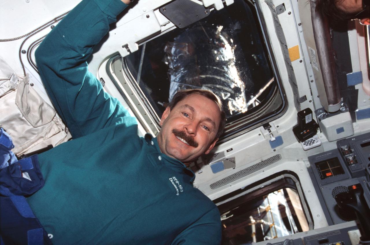 STS103-377-015 (19-27 December 1999) ---.Astronaut Curtis L. Brown, mission commander, on Discovery's flight deck. The captured Hubble Space Telescope (HST) is visible through the windows just a few meters away in the shuttle's cargo bay.